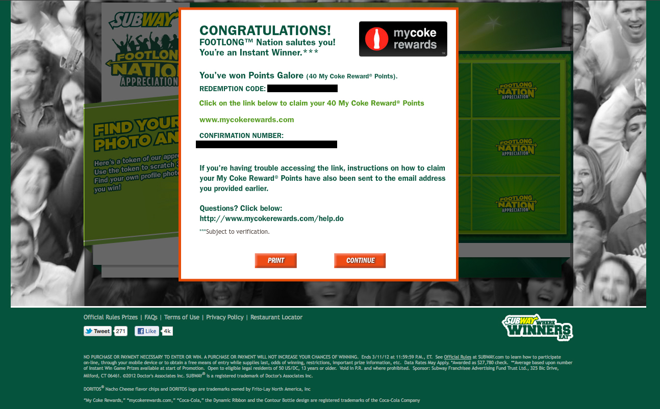 #35 - Online Contest - Subway - 40 Coke Sweepstakes Reward Points