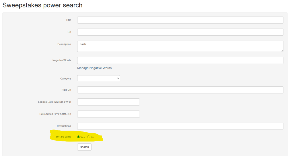 So for example if you would like to see all the sweepstakes that have Cash as the prize. You would specify “cash” in the description field of the form and select the Sort by Value option. You can do this for any keyword really or any category. ( see example below )