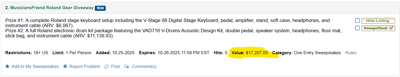 Announcement : If you follow our forum for announcements we have been telling everyone that we have a big change coming. The change is that we now have a Value or ARV stated for each new listing. This will allow members to quickly scan listings to see which sweepstakes have the biggest prizes. In some cases where the sponsor did not mention a value it has been estimated for you by our editors. ( see example below )