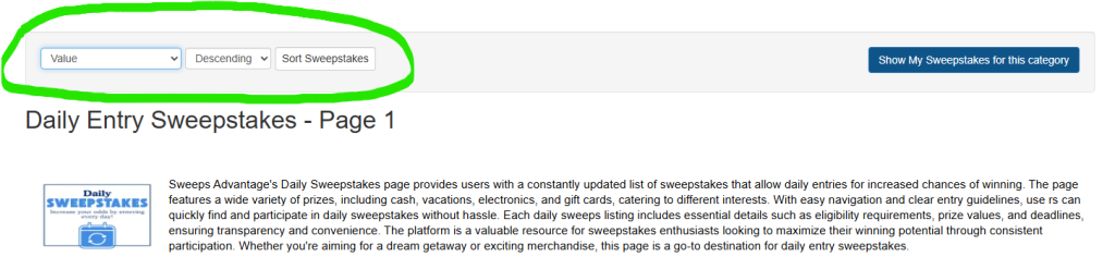 Notes : The sort by value option has been added to the categories pages on sweepsadvantage.com and sweepstakesplus.com.
